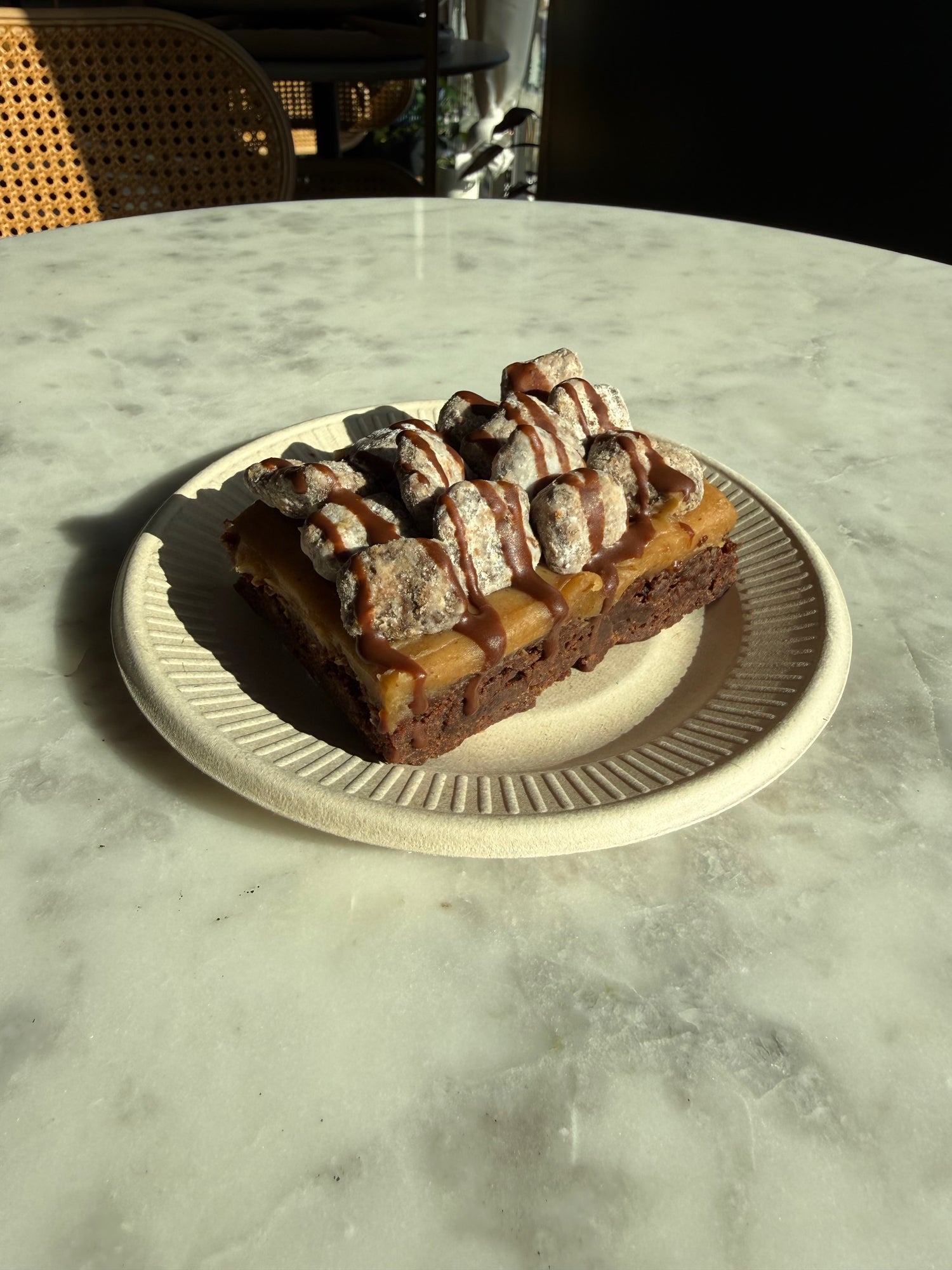 Chocolate brownie topped with peanut butter frosting, house made puppy chow, and chocolate drizzle.