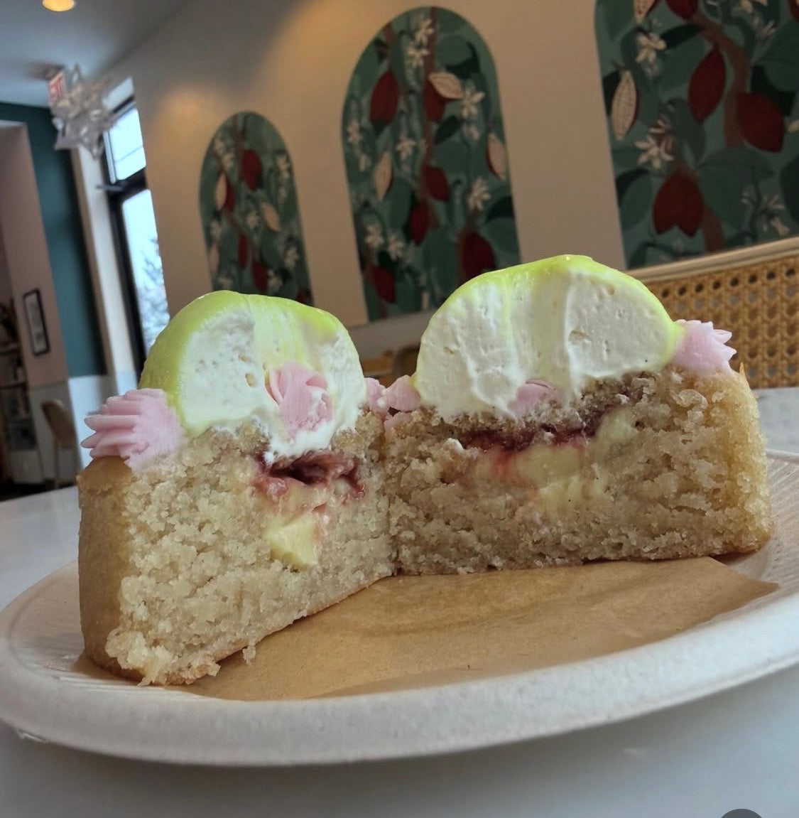 Vanilla cake filled with raspberry jam and vanilla pastry cream topped with a dome of whipped cream and an almond glaze. Our take on a Swedish Princess cake made in limited quantities. Gluten free and always vegan
